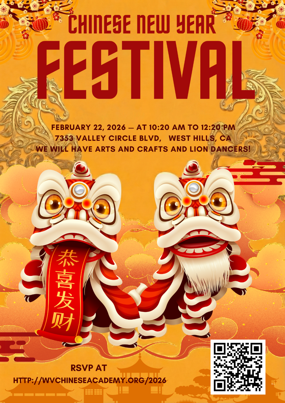 Join us for our annual Lunar New Year Festival on Feb 22nd, at 10:20 a.m. We will have student performances, arts and crafts and Lion Dancers!